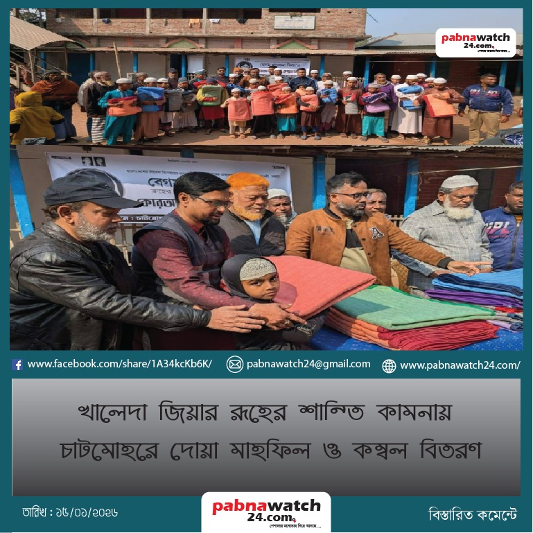 তিনবারের প্রধানমন্ত্রী ও বিএনপি চেয়ারপারসন দেশনেত্রী বেগম খালেদা জিয়ার রূহের মাগফিরাত ও শান্তি কামনায় পাবনার চাটমোহরে পবিত্র কোরআন খতম, দোয়া মাহফিল ও এতিম শিশুদের মাঝে কম্বল বিতরণ কর্মসূচি অনুষ্ঠিত হয়েছে।